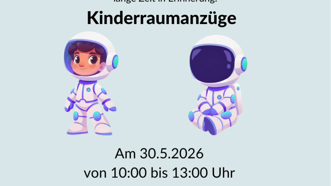 30.05.2026 Science Afternoon "Kinderraumanzüge" Anmeldung bitte unbedingt über das Science Afternoon Portal tätigen. Für Kinder von 06-12 Jahre
